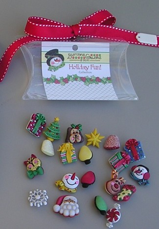 Special offer, limited quantity.20 Holiday Fun 3-D buttons in a clear Pillow Box with hang tie and gift tag.