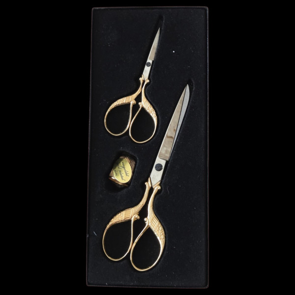 A two-scissor gift set from the WASA forge. Includes gold-plated embroidery scissors in two sizes — 5½" and 3½" (Art. 97) — plus a gold-plated thimble, all presented in a velvet-lined display case. The larger pair handles general needlework and sewing, while the smaller pair is sized for fine embroidery detail. Both are hand-forged from Solingen carbon steel with precision-ground blades. Made in Solingen, Germany by WASA since 1907.